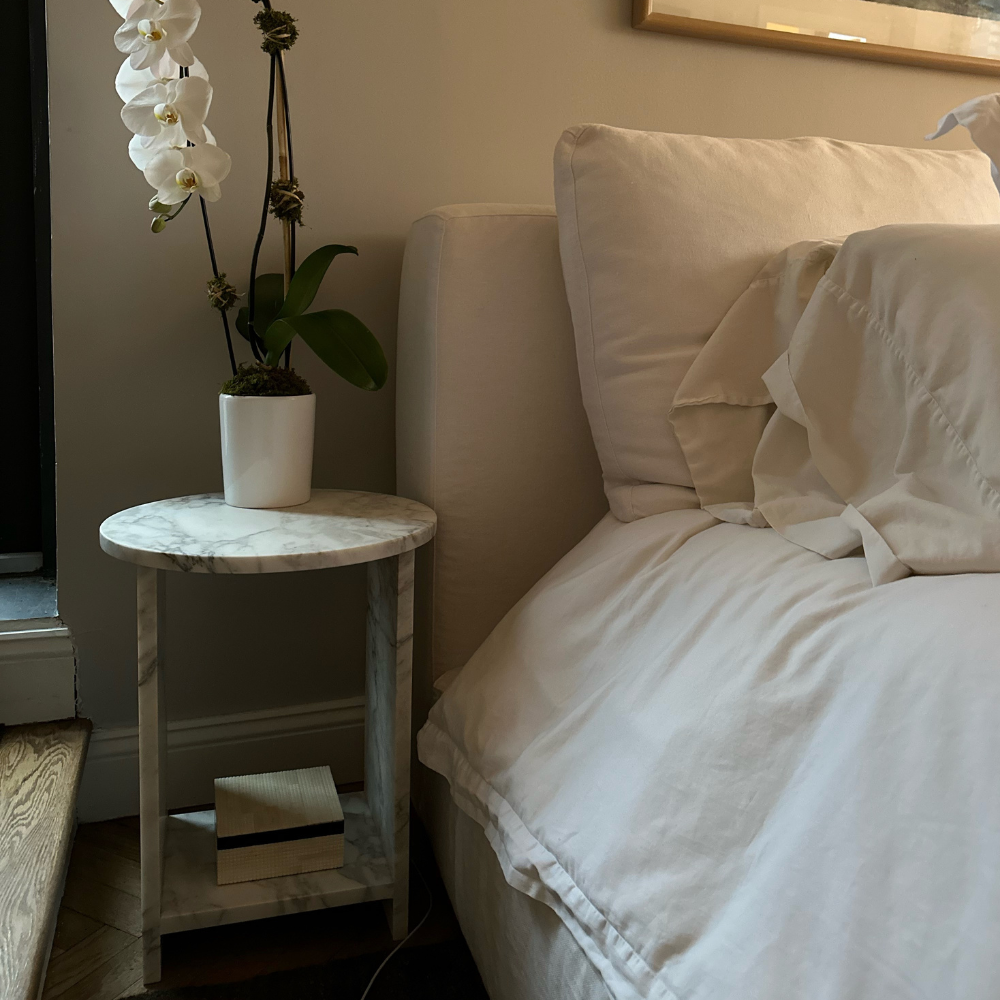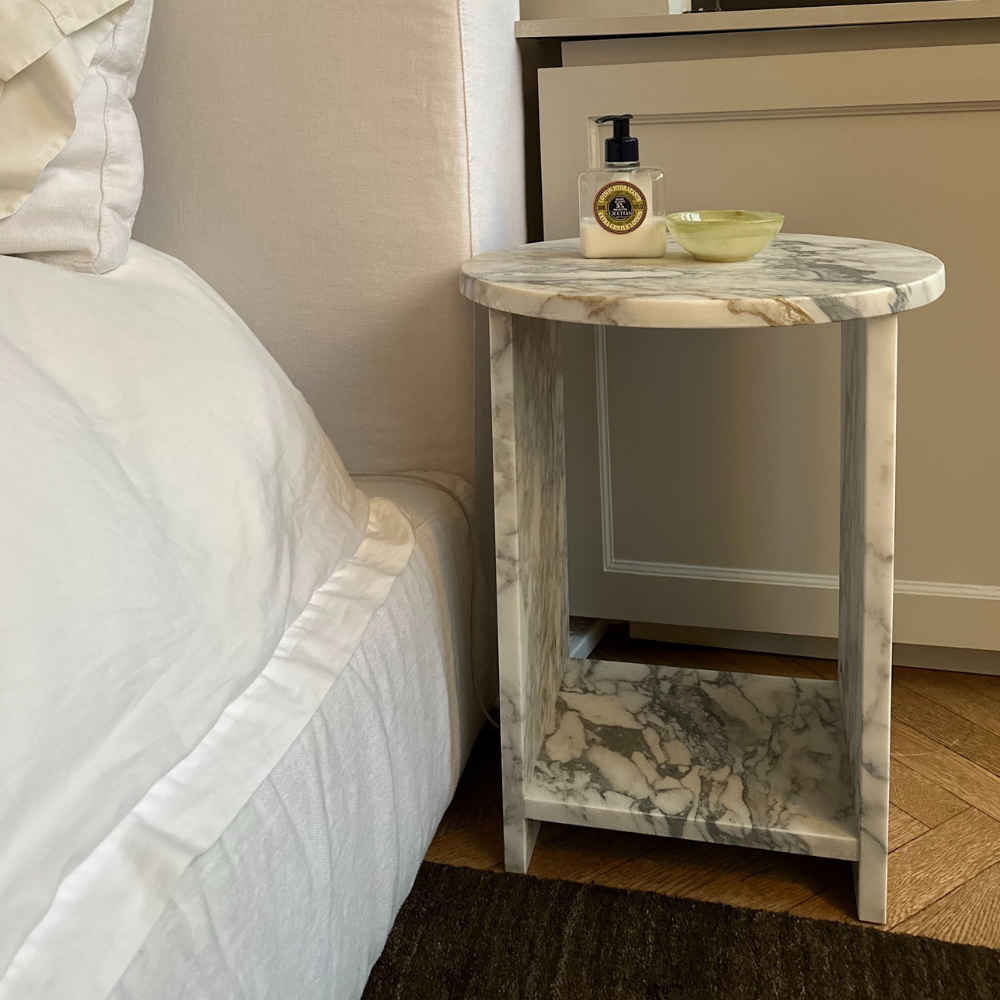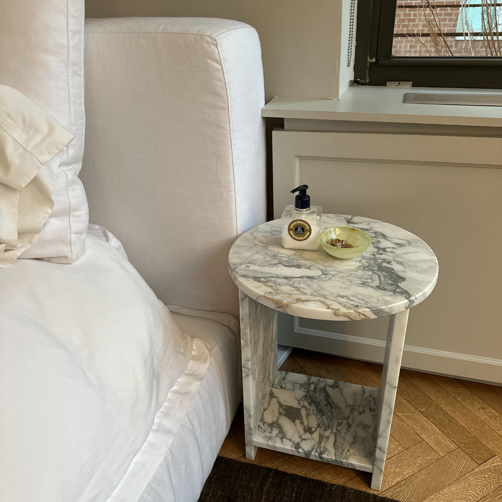 This unique calacatta marble side table -inspired nightstand offers a blend of minimalism and sophistication. It allows you to customize every detail according to your preferences, creating a truly unique furniture piece. Whether you prefer it with or without a shelf, this nightstand is entirely adaptable to your imagination and needs SH Marble, we specialize in crafting exquisite, custom-made marble tables that blend timeless elegance with modern design. Our collection features premium Italian marble, sourced from the finest quarries in Italy, ensuring unmatched quality and durability. Each piece is uniquely designed, showcasing the natural beauty, unique veining, and subtle shades that make marble a sought-after material for luxury furniture.