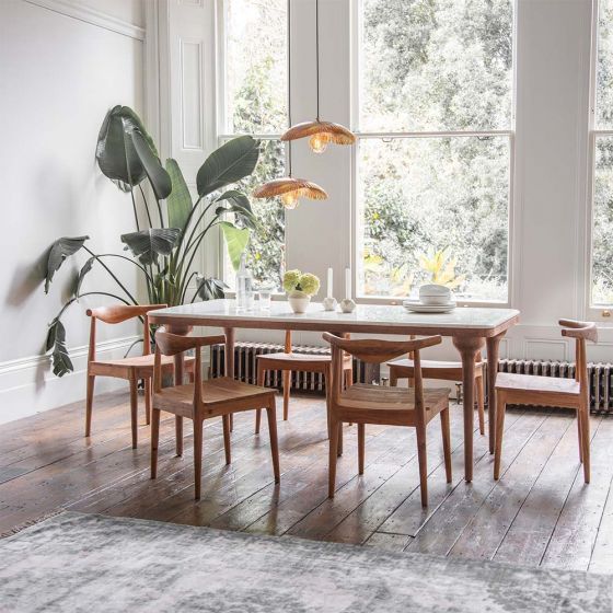 A statement six to eight seater table for the dining room or open-plan kitchen, our Cone Marble Dining Table in solid wood is a design-led piece inspired by nature’s organic shapes. Combining cool white marble with solid acacia wood and robust solid turned wooden legs, this hand crafted table has been skillfully wire brushed to draw the natural wood grains out for a more tactile feel.