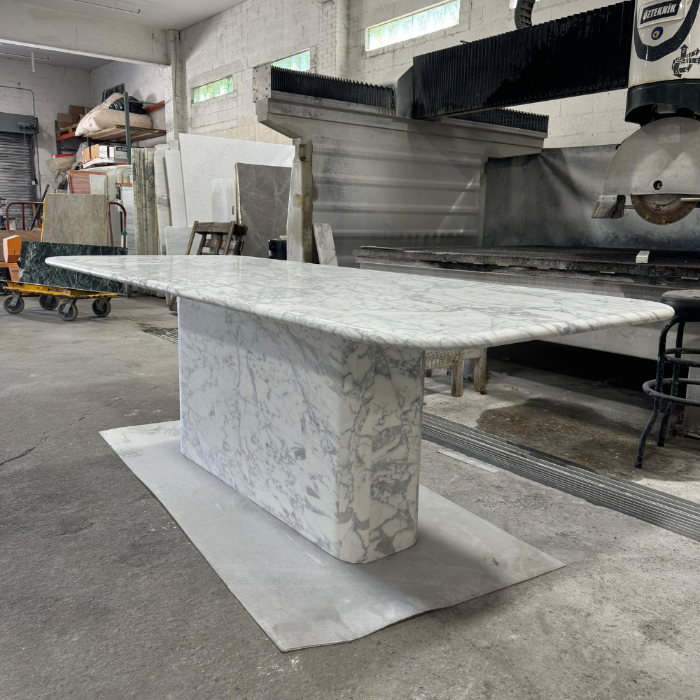Calacatta marble dining tables are renowned for their luxurious appearance and timeless elegance. The distinguishing feature of Calacatta marble is its striking, bold veining, often in shades of gray that run across a white or creamy backdrop. These veins can range from soft, delicate lines to dramatic, sweeping patterns, adding a sense of depth and movement to the table's surface.