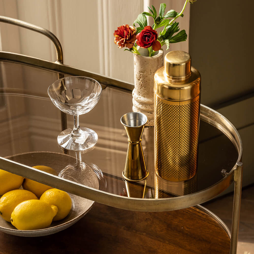 But what to put on your drinks trolley? We suggest styling it up with cocktail accoutrement, gorgeous glassware, beautiful bottles, covetable accessories and a plant for a pop of greenery.