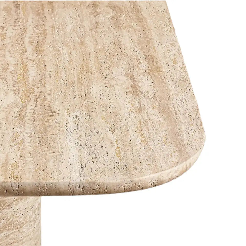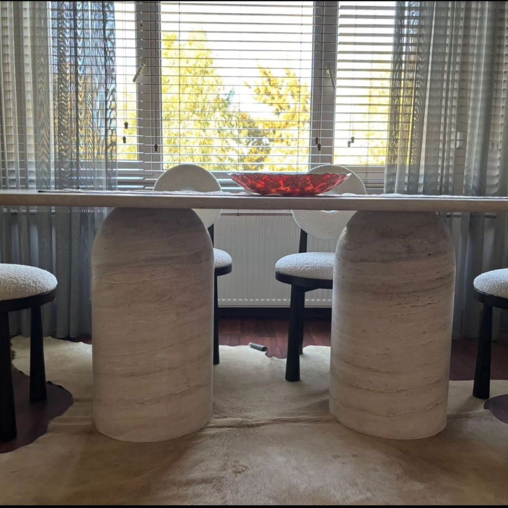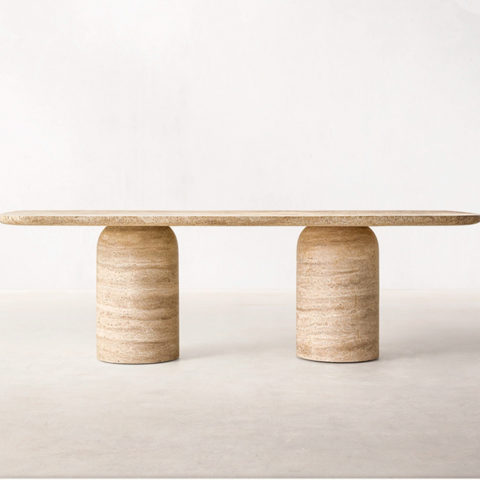 Travertine dining table is based on geometric forms and shapes. Their conic-shaped legs and round-edged rectangular tabletop come together in harmony to form this simple yet sophisticated design that is guaranteed to make a statement in any space.